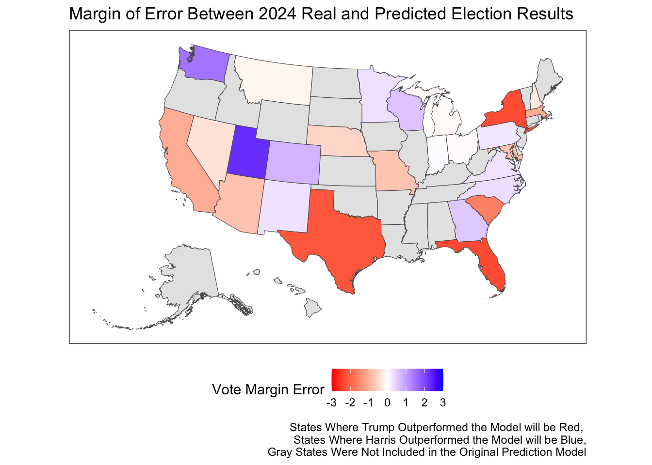 Georgia: My model correctly predicted that Georgia would swing for Trump. Furthermore, the margin of error between my prediction model and the actual result was only 0.44 percentage points: a relatively small under prediction for Trump. My working hypothesis as to why my model was more accurate in Georgia is that polls in Georgia have been incredibly accurate in the Trump era, especially compared to polling in other states. According to FiveThirtyEight, Georgia’s average polling miss across 188 polls since 2016 was only 3.4 points (FiveThirtyEight, 2024). I believe this enhanced accuracy in accounting for the Trump-effect increased the accuracy of Georgia’s prediction.